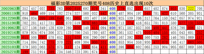 解密:领先,直选408开出之后,10期内开出豹子号0次,2003年-2025年在开出直选408之后,10期内组三累计出现24次,组三在将来第1-5期出现概率为89%,组三在将来5-10期出现的概率为78%。